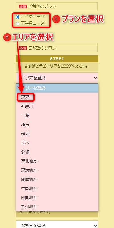 個人情報の入力が終わったら、次に希望のプランと体験エステを受けるサロンの選択をします。