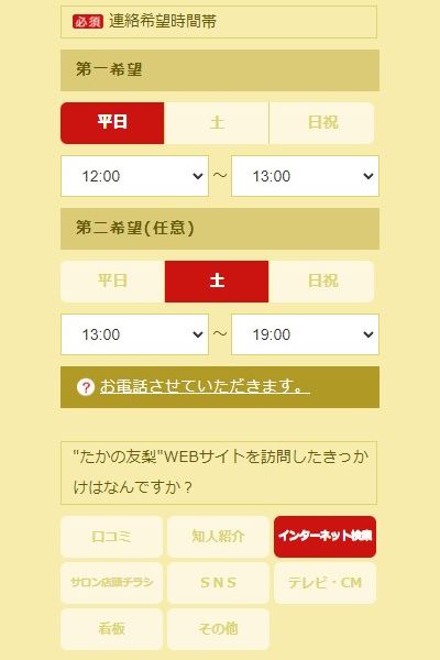 体験エステの予約申し込みをした後に、たかの友梨ビューティーコールセンターから折り返し確認の電話がかかってくるので、電話が受けられる曜日と時間帯を選択します。