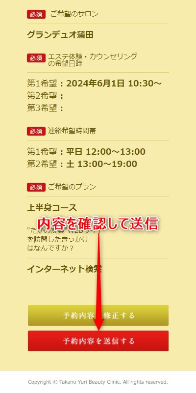 体験エステの申し込み内容に間違いがなければ、【予約内容を送信する】を選択。